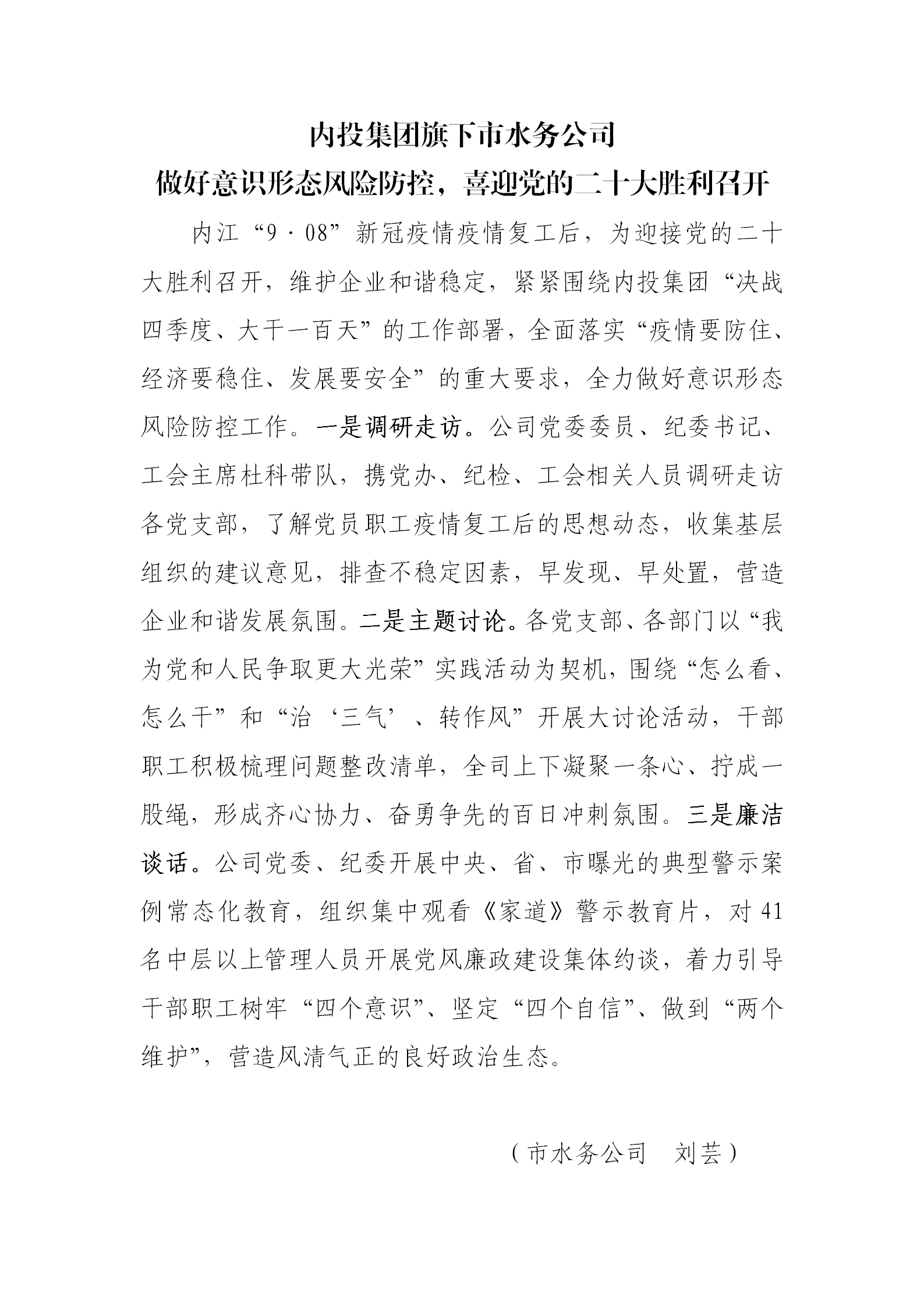 內(nèi)投集團(tuán)旗下市水務(wù)公司 做好意識形態(tài)風(fēng)險防控,喜迎黨的二十大勝利召開