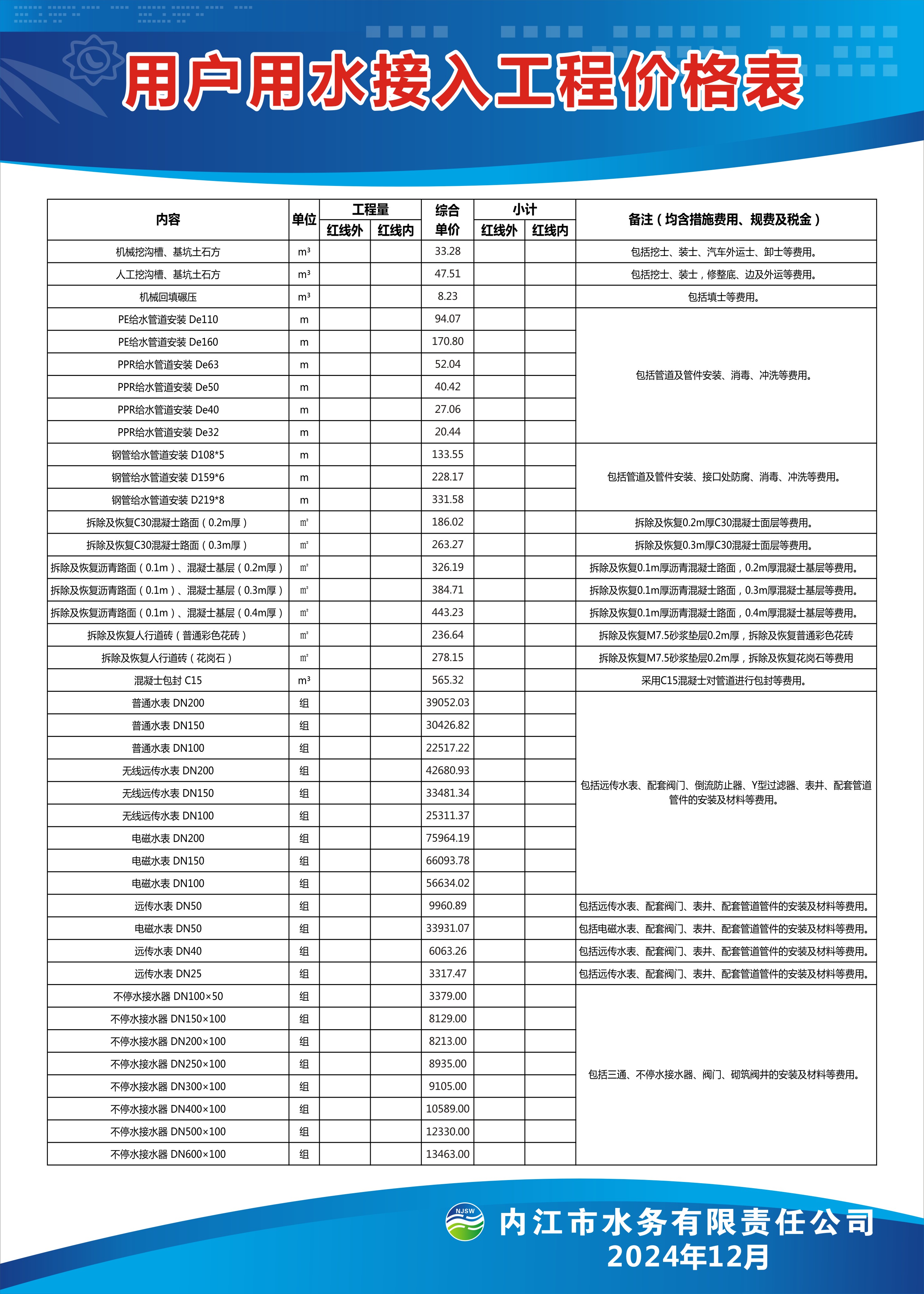 內(nèi)江市水務(wù)有限責(zé)任公司用戶用水接入工程價格表