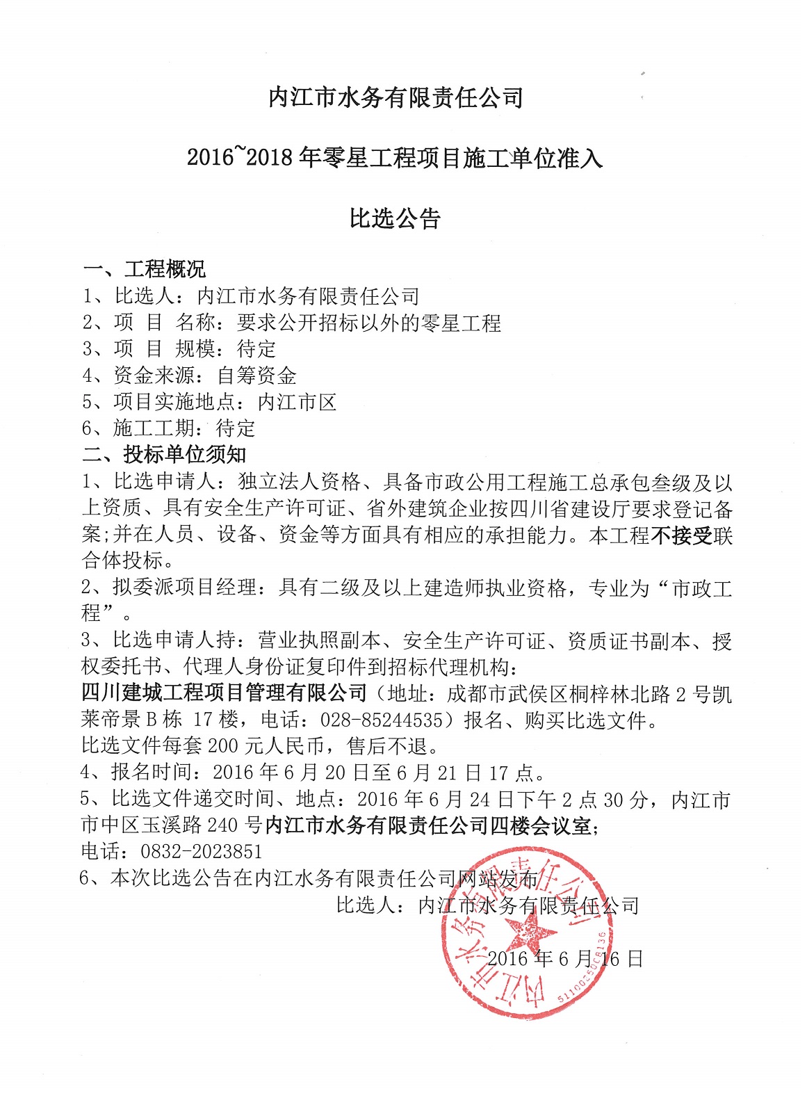 內(nèi)江市水務(wù)有限責(zé)任公司2016~2018年零星工程項目施工單位準(zhǔn)入比選公告