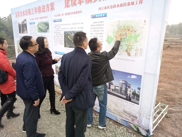 11月28日,省環(huán)境保護(hù)廳副巡視員姚東升一行到內(nèi)江,對落實(shí)污水垃圾三年推進(jìn)方案落實(shí)情況進(jìn)行調(diào)研。調(diào)研組先后來到了桐梓壩大橋至壽溪河口綜合環(huán)境整治工程、謝家河黑臭水體整治、東興區(qū)垃圾壓縮站及環(huán)衛(wèi)車輛專用停車場,最后來到我司第二污水處理廠建設(shè)施工現(xiàn)場進(jìn)行實(shí)地調(diào)研。公司黨委副書記、紀(jì)委書記、工會主席李濤在《落實(shí)污水垃圾三年推進(jìn)方案,建設(shè)幸福美麗內(nèi)江》展板前對項(xiàng)目推進(jìn)情況作了詳細(xì)匯報(bào),并報(bào)告了下一步工作計(jì)劃。