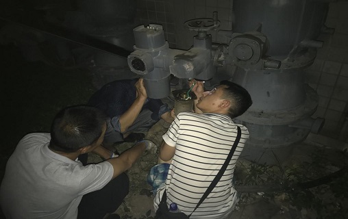 5月16日晚上19:43分,污水處理廠一期4號生化池進(jìn)氣閥跳閘,檢修人員放棄自身休息時間,立即趕赴現(xiàn)場開展搶修。