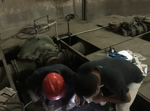 為節(jié)約生產(chǎn)成本,鍛煉員工操作技能,由二水廠員工負責(zé)對電機基礎(chǔ)加工改造及后續(xù)校正安裝等工作。進入7月持續(xù)酷暑,受上游強降雨影響,沱江原水濁度上漲,二水廠在處置高濁水的間隙,趕往城區(qū)水廠對1#電機基礎(chǔ)的鋼板進行焊接。深井泵房噪音大、空氣流通性差、溫度高,但維修人員不畏艱辛,身穿防護服,花費數(shù)天時間終于完成了電機基礎(chǔ)改造工作。